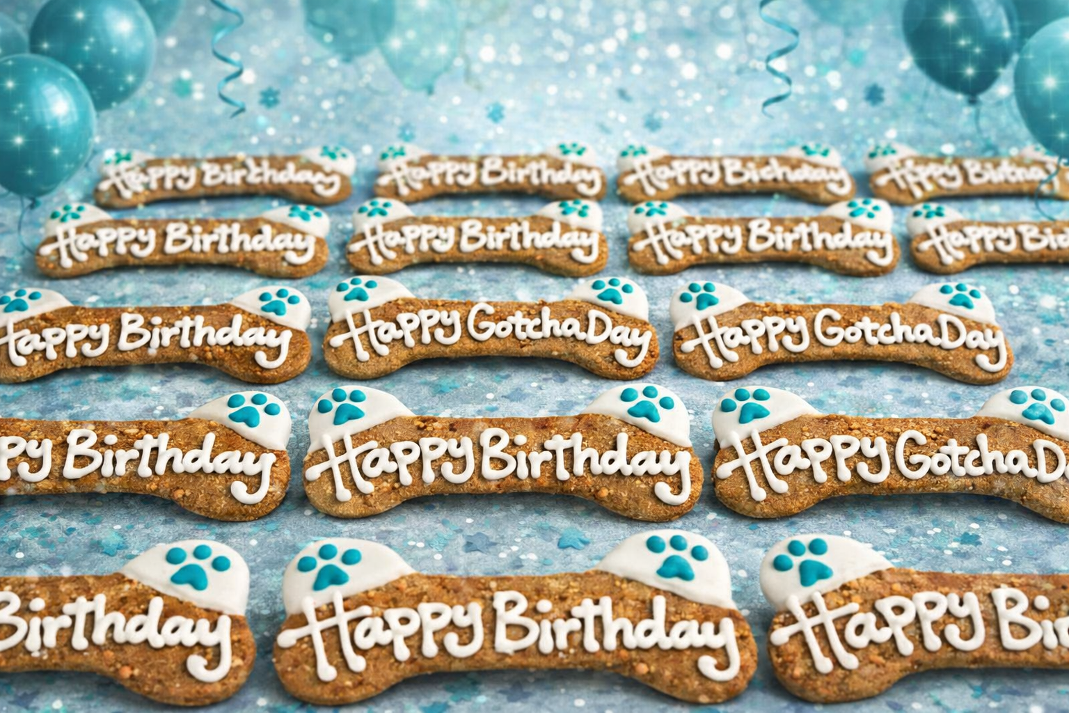 One of our most eye-catching treats is our giant 8-inch celebration bone. It’s most often decorated with “Happy Birthday,” but can be personalized with absolutely anything you’d like. Names, numbers, inside jokes — if it fits, we’ll write it. It’s the ultimate way to celebrate a very good dog.